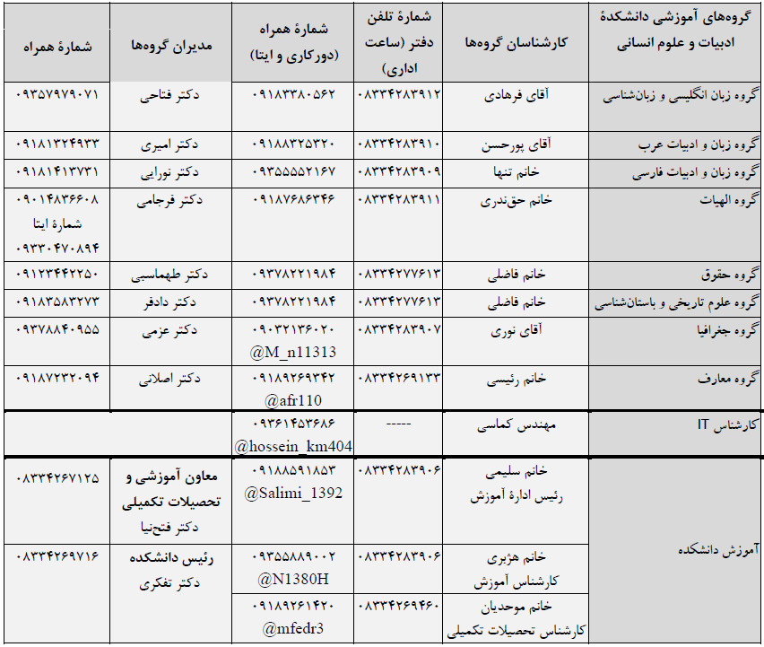 شماره تلفن ضروری همکاران دانشکده ادبیات و علوم انسانی برای ارتباط دانشجویان